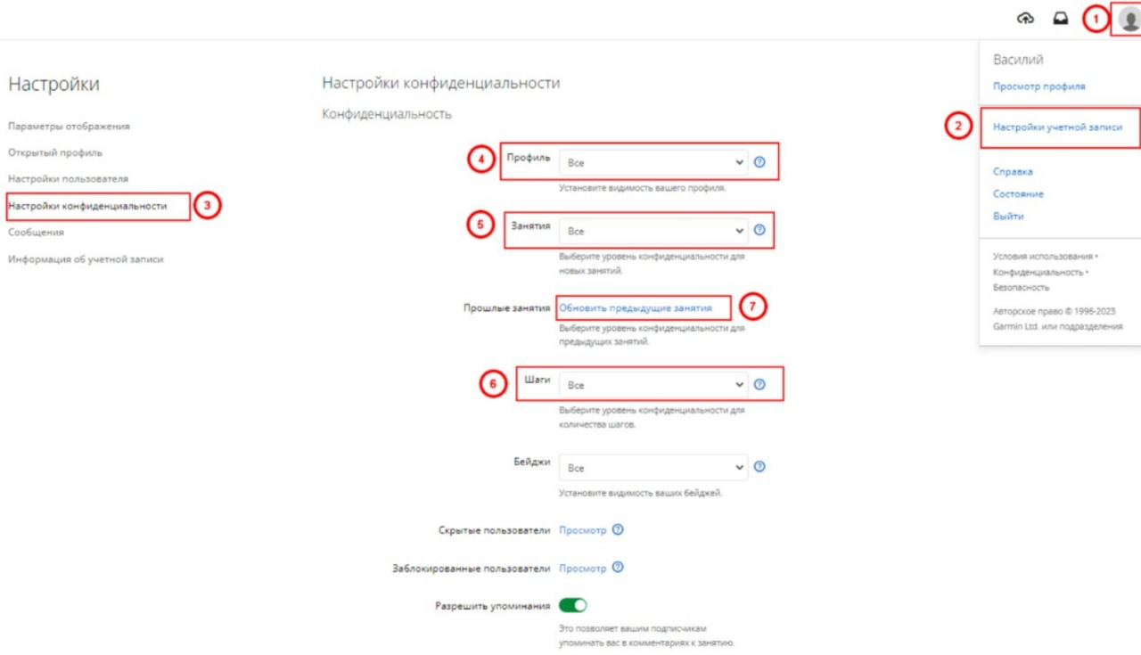 В трекере Garmin нажмите на иконку вашего аккаунта и выберите «Настройки учетной записи». Далее в настройках конфиденциальности проверьте, что доступ к тренировкам открыт для всех. Для публикации всех тренировок нажмите на кнопку «Обновить предыдущие занятия», выберите «Все» и обновите.