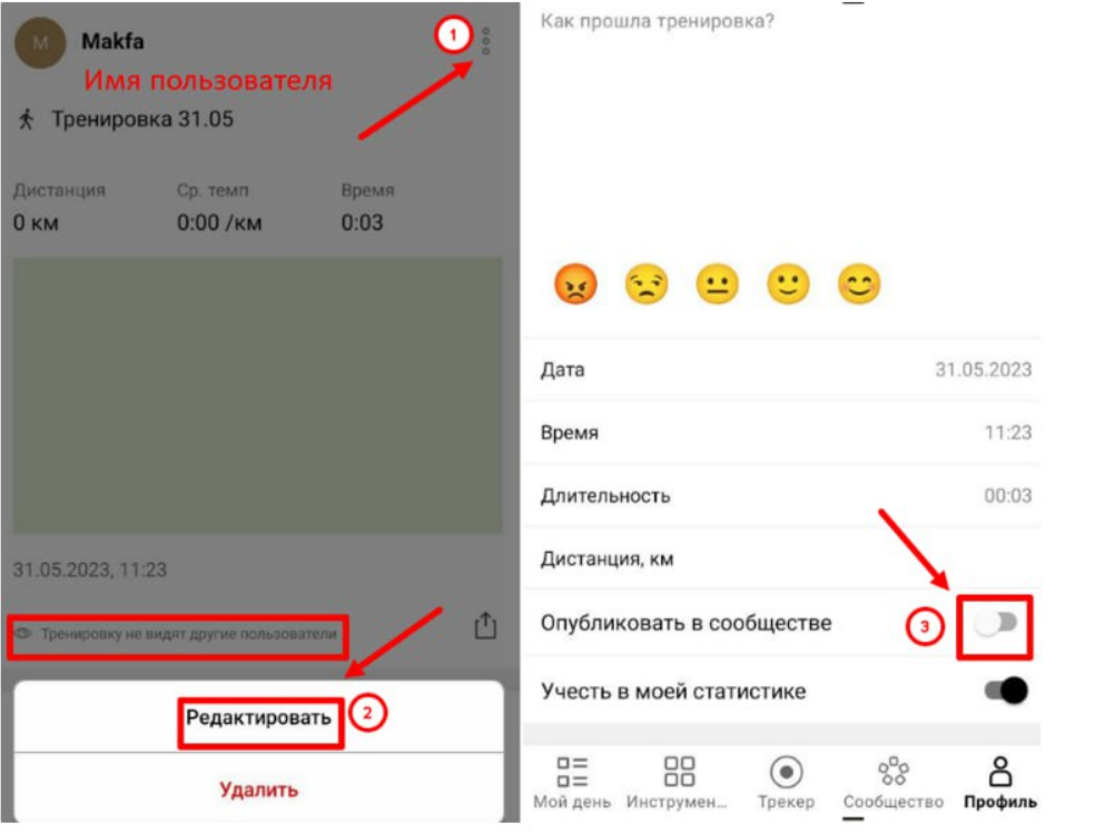 В трекере Simple Run, rогда потребуется, скопируйте или перепишите ваше имя из Профиля пользователя и предоставьте его, чтобы мы смогли найти ваш профиль. Если тренировка скрыта («Тренировку не видят другие пользователи»), то нажмите на три точки и «Редактировать», далее активируйте «Опубликовать в сообществе».