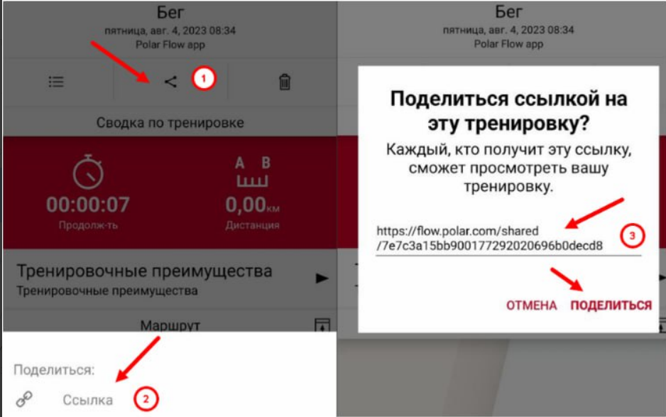 В трекере Polar откройте тренировку и нажмите на кнопку «Поделиться» и «Ссылка». Когда потребуется, скопируйте ссылку и предоставьте её.